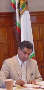 Fidel Herrera Beltrán (center); behind, on the wall, a picture of former Mexican President Benito Juárez García (above center), the National flag (left),