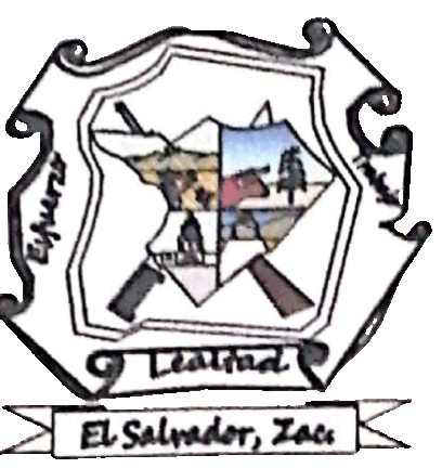 The coat of arms of El Salvador was adopted during the term of 2007-2010 under Municipal President Plutarco Zavala Torres. It was adopted through a call for submissions from the council; the winning design being the one by Juan Francisco López Alvarado. Over a scrolled border, the sides (left, right, bottom) read the motto Esfuerzo, Trabajo, Lealtad. At the bottom, a ribbon reads El Salvador, Zac. In the center, bordered by a random shape, a map of the municipality is divided into four quadrants. The upper-left depicts a hill with a palm tree and cactus, basic alimentation of cattle. To the upper-right, a head of cattle and a corn plant, basic alimentation of the municipality and industry. To the lower-left, the local Church of the Divine Savior. To the lower-right, its entrance with a path and the hills in the background. Behind, a sword and gun for work and defense.