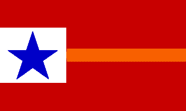 I would interpret this description differently. In my opinion, the Chronicle article may have inadvertently changed the description by the misuse of a comma. I think it more naturally should have read "a red field, in the center and at the end next to the pole … a small white square field, in the center … a single blue star. From this small white field and extending lengthwise … across the red field, … an orange stripe." Since the hoist square is described as "small", I think it would have been no bigger than a third of the hoist. That orange (probably should be gold) stripe, also a third of the hoist. This strongly resembles some variants of the old Spanish flag with a star for independence.