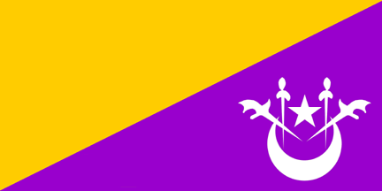 Diagonally divided flag, yellow upper hoist and purple bottom fly, arms centred on the bottom fly.