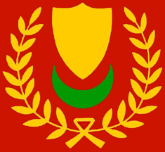 Kedah has a red flag with golden shield over a green crescent surrounded by a yellow wreath in the canton.