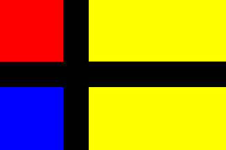 Flag adopted 23 August 1963. Design by the 'Fryske Rie foar Heraldyk' (Frisian Council for Heraldry). Yellow is the color of the field of the municipal Coat of Arms; blue of the globe in the Coat of Arms and black of the cross on the globe. Red is the color of the arm holding the globe. Source: Vexillia Nostra 124, p. 17.