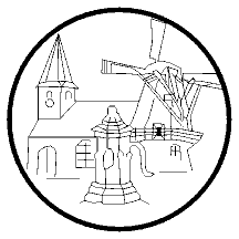 black silhouetted drawings of a church, a mill, and the villagepump, aka