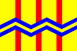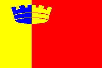 A new flag was adopted 2 Jan 1994 by municipal decision: quartered over 1/3 of flaglength of green, yellow, blue, and white, with on green in white the contours of a facing "emptied" ox's head.