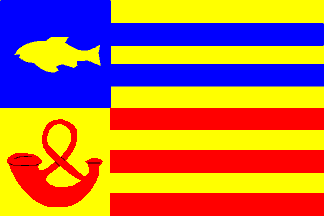 Flag: a hoist of blue and yellow, with on blue a yellow fish, on yellow a red banded horn, and a fly of 10 stripes yellow - blue - yellow - blue - yellow - red - yellow - red - yellow - red.