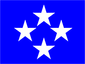 Flag: blue field, 4 white five-pointed stars placed 1,2,1 (no Micronesian