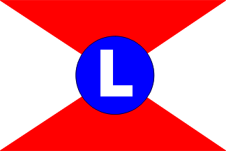 The flag was divided quarterly: top and bottom triangles red, hoist and fly triangles white plus a blue disk in the centre bearing a white initial ‘L’.  (I suppose none of the black holding lines are significant.)