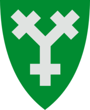 Blazon: I grønt tre sølv kors samlet i form av et gaffelkors. In English: Vert three crosses in a pall conjoined argent.