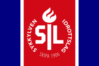 The flags of Sykkylven IL (Sykkylven Idrettslag) from Aure in Sykkylven Municipality include several varieties: a red pennant, a red and white chequered flag, and a vertically banded blue-red-blue flag with white fimbriations and the badge centered.
