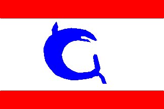 Sandefjord - white flag, top and bottom red; in center blue jumping whale in the