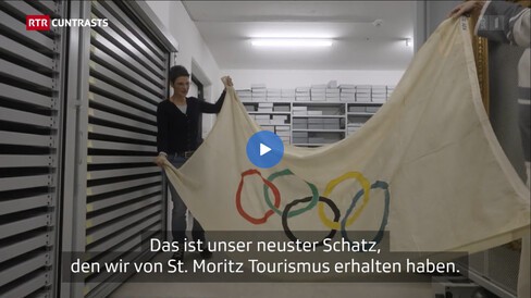 The Swiss-Romansh TV station RTR broadcasted yesterday a documentary film about the first filmic documents from Grisons canton ("Glisch, camera and acziun – emprims documents filmics dal Grischun"). While researching also a contemporary film about the 2nd Winter Olympics in St. Moritz from 1928, the library of St. Moritz showed to the film team the official flag of the games (Before the 6th Games in Oslo in 1952, the Olympic flags weren't handed over to the following organizers). It was recently donated from the St. Moritz Tourism Organization.