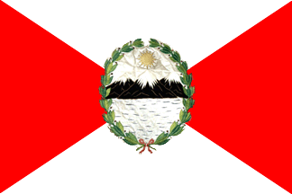 Will be adopted as national flag of the country one of silk or linen eight foot long by six broad, divided by diagonal lines in four fields, white the two extremes superior and inferior, and flesh-colored the lateral two, with an oval-shaped laurel wreath, and within that a sun setting over snowed mountains above a quiet sea. The shield can be painted or embroidery, but preserving each object their colors, to know: the laurel wreath to be green and tied in the lower part with a ribbon of gold color; blue the upper part that represents the sky; yellow the sun with its beams; the mountains of an dark brown color, and the sea between blue and green.