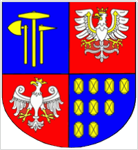 - a Coat of Arms of Małopolskie Voivodship, on red background.