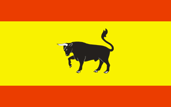 A proposal of the Sejny County flag presented in 2011 Proposal Flag is horizontally divided red-yellow-red (1:3:1) with a black bull in center of cloth. A typical "Spanish" design.