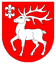 "Arms - on a red field a white Red Deer standing to the right. In the upper right corner a "gozdawa" (double lily).