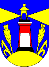 Coat of Arms: azure a lighthouse gules issuant with head and rays or, between two cornears issuant or; a base or.