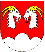 Coat of Arms: gules two goat's heads argent horned or facing; in base a threemound argent. ("koza" = goat)