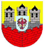 "Arms: on a yellow shield a corner of the defensive walls and above it, three red towers covered with black roofs and red balls.
