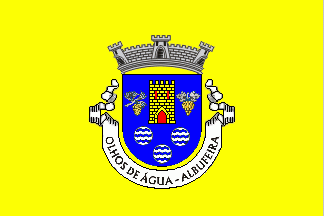 Shield Azure, a rectangular, embattled tower Or masoned Sable with port and windows Gules flanked at dexter by a branch of pine Argent fruited Or and at sinister by a grapevine Or leaved Argent, in base three heraldic fountains ordered 2:1. Mural crown Argent with three visible towers (village rank) and white scroll with inscription in black initials: "OLHOS DE ÁGUA - ALBUFEIRA".