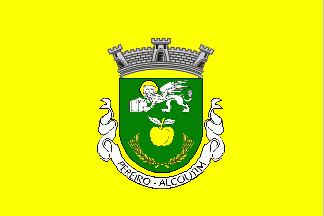 Shield Vert, in chief a winged lion passant, guardant Argent, nimbed Or holding a book Argent by his forepaws, in centre an apple Or leaved Argent, flanked in base by two wheat ears Or crossed per saltire. Mural crown Argent with three visible towers (village rank) and white scroll with inscription in black initials: "PEREIRO - ALCOUTIM"