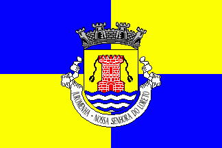 It is a typical Portuguese communal flag, with the coat of arms centred on a field quartered of blue and yellow.
