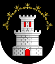 The coat of arms is Sable a towered Argent ((masoned Sable)) with port and windows Gules, surrounded in chief by an arch of seven bees Or pointing to the centre. Mural crown Argent with four visible towers (town rank) and white scroll reading in black upper case letters "VILA DE ALFÂNDEGA DA FÉ" (see right image above).