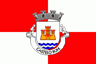 Coat of Arms: Shield Argent with base wavy of Azure and Argent; a castle Gules with three embattled towers, masoned Or, with port and windows Or. Mural crown Argent with four visible towers (town rank) and white scroll with inscription in black capitals "CASTELO BOM".