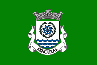 Shield Argent with base wavy of Azure and Argent, an 8-spokes wheel Azure bladed Sable, surrounded by two wheat ears Vert in circle. Mural crown Argent with three visible towers (village rank) and white scroll (Bénard Guedes style) with inscription in black capitals "SENOURAS".