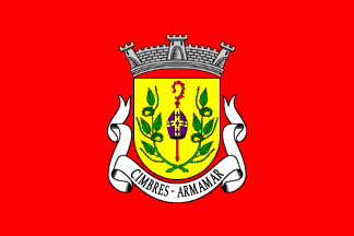 Shield Or a bishop´s crozier Gules surmounted by a mitre Purpure garnished Or, the whole flanked by two chestnut branches Vert fruited Or with their stem tips crossed saltirewise at base. Mural crown Argent with three visible towers (village rank) and short white scroll, in Bénard Guedes style, reading in black upper case serifed letters "CIMBRES - ARMAMAR"