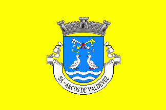 Shield Azure with base wavy of Argent and Azure, two geese affront Argent armed Gules, in chief a pair of keys crossed per saltire tied Gules, the sinister bendy one Or and the bendy one Argent. Mural crown Argent with three visible towers (village rank) and white scroll with inscription in black initials "SÁ - ARCOS DE VALDEVEZ".