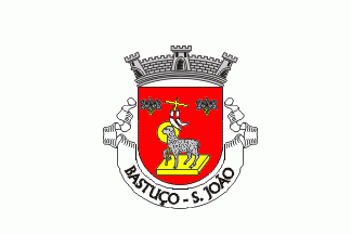 Shield Gules, a Paschal Lamb passant Argent nimbed Or and standing on a book Or, in chief two grapevines Or leaved Argent. Mural crown Argent with three visible towers (village rank) and white scroll with inscription in black capitals "BASTUÇO - S. JOÃO".