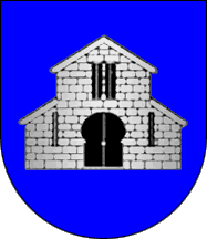 Shield Azure, a monastery Argent masoned Sable with its doors and windows Sable. Mural crown Argent with three visible towers (village rank) and white scroll reading in black upper case serifed letters "ARENTIM".