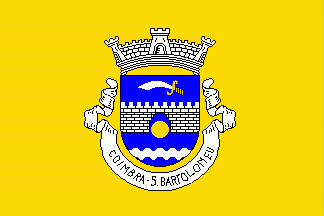 The arms are Azure an embattled wall Argent masoned Sable, in chief a scimitar Argent with hilt Or, in open gate a bezant Or, in base a fess wavy Argent. Mural crown argent with three visible towers (village rank) and white scroll reading in black upper case letters "COIMBRA - S.BARTOLOMEU".
