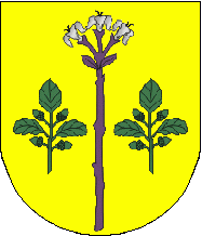 Shield Or, a paly baton Purpure crowned by three blossoms Argent flanked by two twigs of oak Vert. Mural crown Argent with three visible towers and white scroll reading in black capitals: "" (village rank)