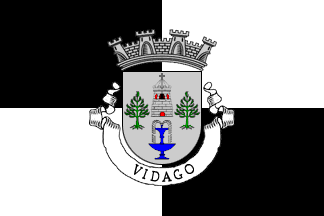Shield Azure a fountain effervescent Argent, in chief a fig leaf Or at dexter and a grape bunch Or leafed Argent at sinister. Mural crown Argent with four visible towers (village rank) and white scroll reading in black upper case serifed letters forming two lines of text with different sizes "VIDAGO (UNIÃO DAS FREGUESIAS DE VIDAGO, ARCOSSÓ, SELHARIZ E VILARINHO DAS PARANHEIRAS)" (see left flag image above). Simplified versions (see right flag image above) with only the word "VIDAGO" are likely to emerge.