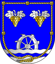 The arms are rather referring to local hydro power, vineyards, and the Order of Saint Francis, represented by the cordon, the attribute of the the founder of the order and local patron saint.