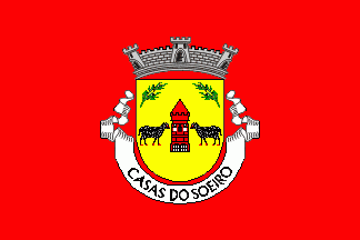 Shield Or; a tower Gules, with cone roof, embattlements and ports and windows Argent; flanked by two sheep addorsed Sable, armed and tongued Gules; in chief two olive branches Vert fruited Sable. Mural crown with three visible towers (village rank) and white scroll reading in black upper case letters "CASAS DO SOEIRO".