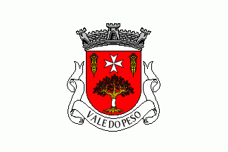 Shield Gules, in base a cork oak eradicated Or, peeled and fruited Argent, in chief a Maltese cross Argent flanked by two rice ears Or. Mural crown Argent with three visible towers (village rank)and white scroll with inscription in black initials: "VALE DO PESO".