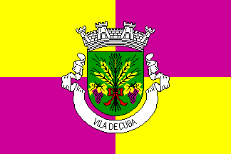 It is a fairly typical Portuguese municipal flag, with the coat of arms centred on a field quarterly (meaning town rank) divided of yellow and purple.