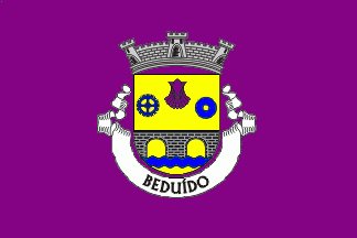 Shield Or, a scallop Purpure between a cogwheel at dexter and a millstone at sinister, both Azure, in base a bar wavy Azure, issuant from bar a bridge Sable masoned Argent having two archs. Mural crown Argent with three visible towers (village rank) and white scroll with inscription in black initials "BEDUÍDO".