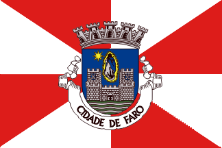 in dexter canton an estoile Or. Mural crown Argent with five visible towers (city rank) and white scroll reading in black upper case letters "CIDADE DE FARO".