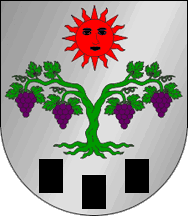Shield Argent, a grapevine with two branches Vert fruited Purpure in four bunches,in chief a sun Gules, in base three billets Sable ordered 2:1. Mural crown Argent with three visible towers (village rank) and white scroll reading in black upper case letters "LIGARES".