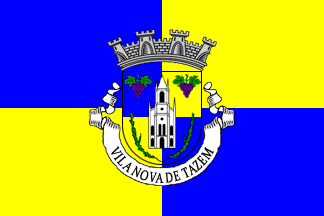 Shield quartered Azure and Or a church Argent, flanked at base by two olive branches Vert fruited Sable, and in chief cantons two grape bunches Purple leafed Vert. Mural crown Argent with four visible towers (town rank) and white scroll reading in black upper case serifed letters "VILA NOVA DE TAZEM".
