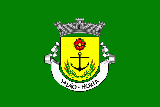 Shield Or; an anchor Sable; in chief a heraldic rose Gules, barbed Vert and seeded Or; in base two triplets of wheat ears Vert crossed per saltire. Mural crown Argent with three visible towers (village rank) and white scroll with inscription in black capitals "SALÃO - HORTA".