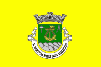 Shield Vert with base wavy having eight peaks issuant Argent ordered in two fesses, a medieval sailing ship Or, in chief at dexter a mason's hammer Argent and at sinister compasses Argent, Mural Crown Argent with three visible towers (village rank) and white scroll reading in black initials: "S. BARTOLOMEU DOS GALEGOS".