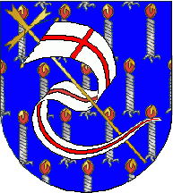 Shield Azure semy of candles Argent flamed Gules and Or, over all a bendy baston bendy Or topped by a cross and fixing a white pennant (flamula) bearing an off-centred throughout cross. Mural crown Argent with three visible towers (village rank) and white scroll reading in black upper case letters"FREGUESIA DO LUMIAR".