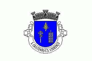 Shield Azure, a shoot Argent blossomed Or at dexter, a gridiron Argent at sinister, in chief a palm leaf Or, each one set in pale Mural crown Argent with three visible towers and white scroll with inscription in black capitals "S. CRISTÓVÃO E S. LOURENÇO".