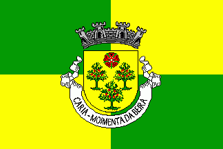 Shield Or three pine trees Vert fruited Sable ordered 2:1, on central chief point a heraldic rose Gules seeded Argent and barbed Vert. Mural crown Argent with four visible towers (town rank) and white scroll reading in black upper case serifed letters "CARIA – MOIMENTA DA BEIRA".