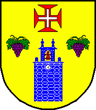 Shield Or, a belfry Azure masoned Argent with clock of the same and bell Gules, flanked by two grapevines Purpure leafed Vert, in chief a cross patty Gules charged with a Greek cross Argent. Mural crown Argent with three visible towers (village rank) and white scroll with inscription in black capitals "FREGUESIA DE MEDA".