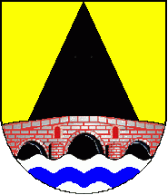 Shield Or with base wavy of Azure and Argent, a 3-arched bridge issuant Argent masoned Gules, issuant from bridge a pile Sable. Mural crown Argent with three visible towers (village rank) and white scroll with inscription in black initials: "FREGUESIA DE MONFORTE"